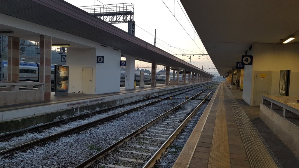 Stazione dei treni di Vicenza, un sabato pomeriggio d’autunno, binario deserto.