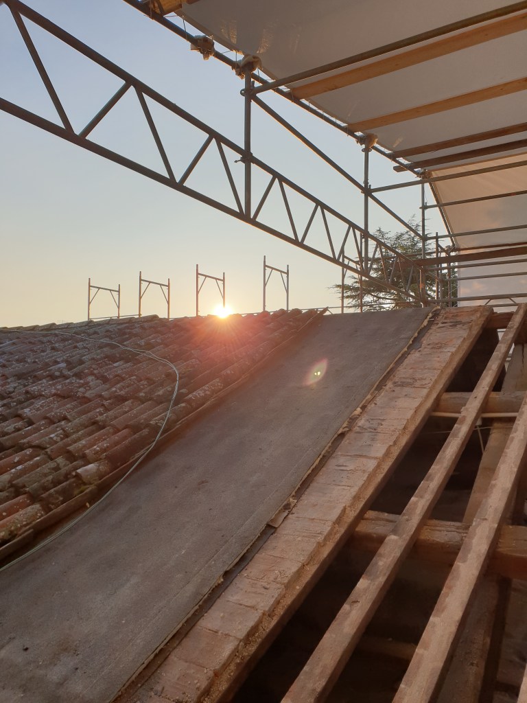 No, no, mica per colpa delle imprese o dei lavoratori, anzi! Mica per i ponteggi creativi che si inerpicavano sulle pareti perimetrali e si attorcigliavano addosso al campanile, su fino alla croce. Mica per le consunte travi del tetto che, una volta svelate, sembravano sospese nel vuoto. Mica per il telo di protezione, teso tra i montanti e posato come un grande cappellino sulla sommità della chiesa, e acrobaticamente adattato all’avanzamento dei lavori.