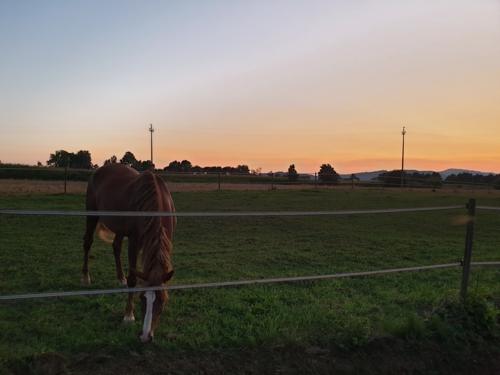 A fermarmi è stato il cavallo nocciola, che beccheggiava lungo le stringhe del recinto. Aveva due complici, a dire il vero: la luce sbieca che lo avvolgeva e, sullo sfondo, la sottile fascia di trapasso tra il profilo scuro della campagna e la pennellata arancio del basso cielo.