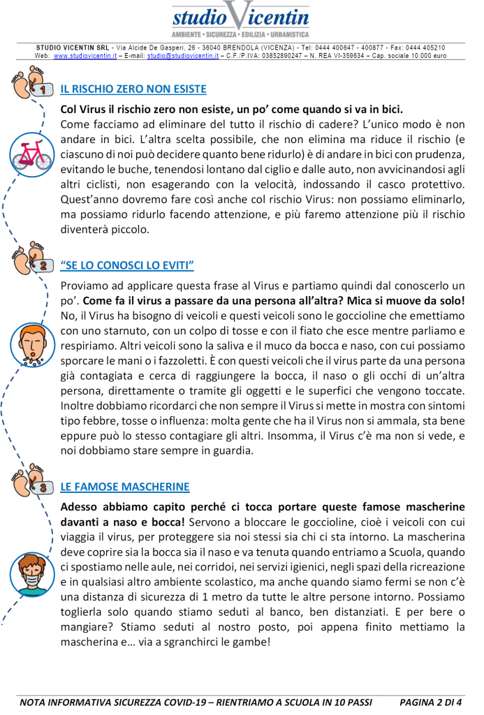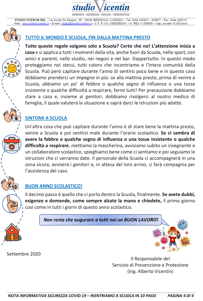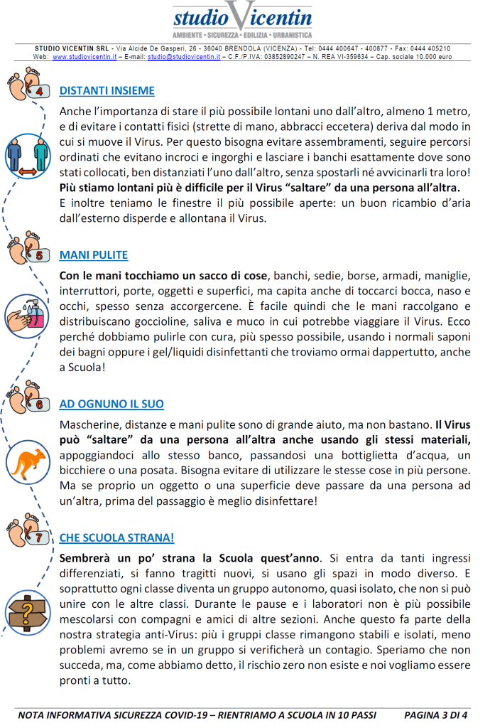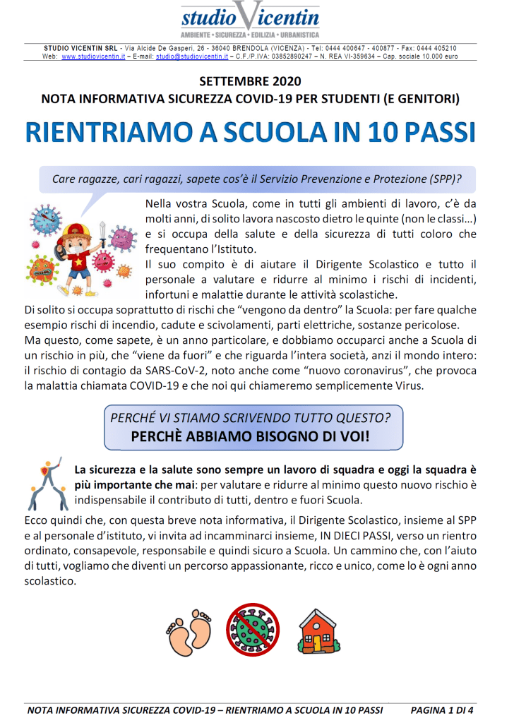 Sarà una materia trasversale che si infilerà in tutte le lezioni, sarà sviluppata prevalentemente con didattica esperienziale e con continue esercitazioni laboratoriali, ma certamente avrà bisogno di qualche base teorica. Non avrà un suo libro di testo ma tanti documenti informativi, distribuiti o affissi, che verranno integrati, adeguati e calibrati nel corso del tempo. Ne abbiamo preparato uno, breve e qualitativo, giusto per (ri)partire, e l’abbiamo chiamato “RIENTRIAMO A SCUOLA IN 10 PASSI”. È pensato con l’ottica del RSPP che per una volta si rivolge direttamente a loro, ragazzi e ragazze, bambine e bambini che finalmente stanno per tornare in aula. E che, a scanso di equivoci, ci torneranno come sempre per imparare, crescere, maturare, anche e soprattutto per la particolarità di quest’anno.