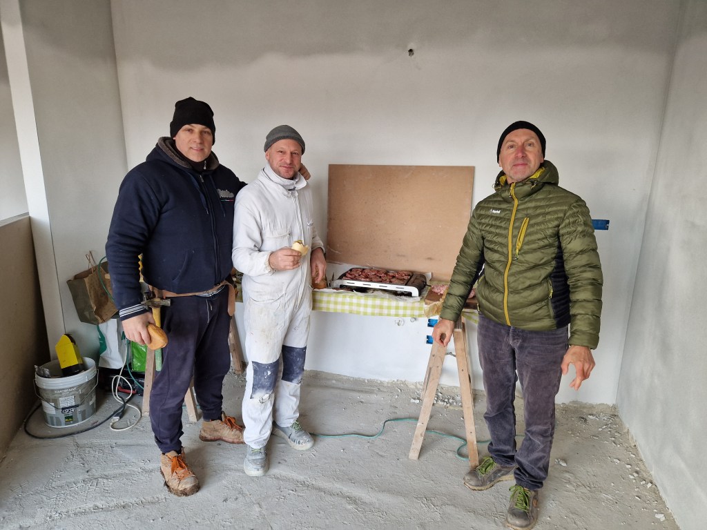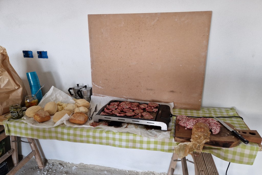 Eccoci allora alle 9.00 in punto, al solito piano della solita palazzina in costruzione, in compagnia della temporanea e mobile popolazione locale, ad ispezionare un’inedita lavorazione con tanto di attrezzatura dedicata (a proposito, devo ricordarmi di controllare se c’è nel POS): la piastra elettrica grill, alimentata nientemeno che dall’impianto di cantiere, i cui elettroni, si narra, garantiscono igiene alimentare ed esaltano i sapori.